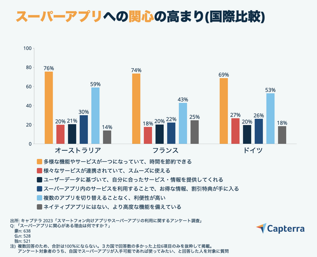 同調査を、スーパーアプリがまだあまり普及していないオーストラリア、フランス、ドイツの3国で行ったところ、1つのアプリ内で様々なサービスを利用でき時間が節約できることから、スーパーアプリへの関心が高まっていることが窺えました。