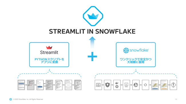 Streamlitは、オープンソースのPython用UIライブラリです。Snowflakeのスケーラビリティ、ガバナンス、広範囲なデータを組み合わせることで、より速く、多様なデータアプリの構築に加えてLLMを活用したカスタムアプリの作成が期待されています。Streamlit社 は2018年に創業され、Snowflakeが2022年3月に買収しています。Streamlit in Snowflakeは2023年12月にGAされています。