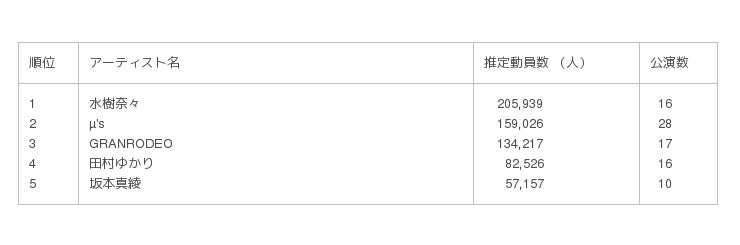 株式会社音技の杜が運営する音楽ライブ情報サービス「LiveFans(http://www.livefans.jp)」は、2015年の観客動員ランキング(※1)および、メーカー別ライブ動員シェア(※2)を発表しました。