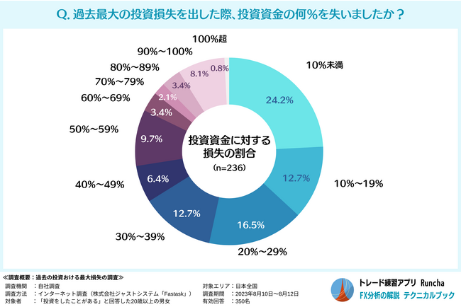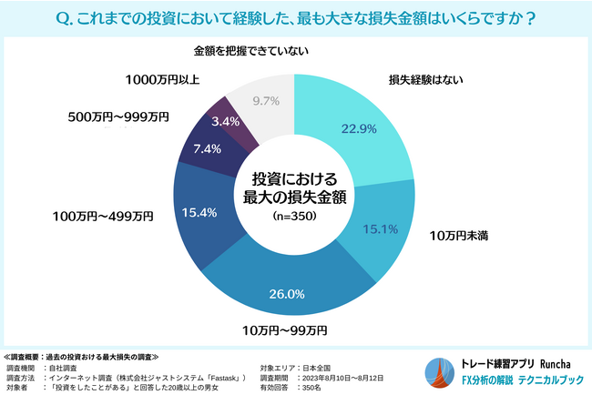 テクニカル分析専門サイト『テクニカルブック』は、投資家が経験した損失について調査する目的で、過去に投資をしたことがある350名を対象にアンケートを行いました。本調査の結果からは、4人に1人の投資家が100万円以上の損失や投資資金の半分以上を失う経験をしているなど、投資家の損失に関する実態がみえてきました。