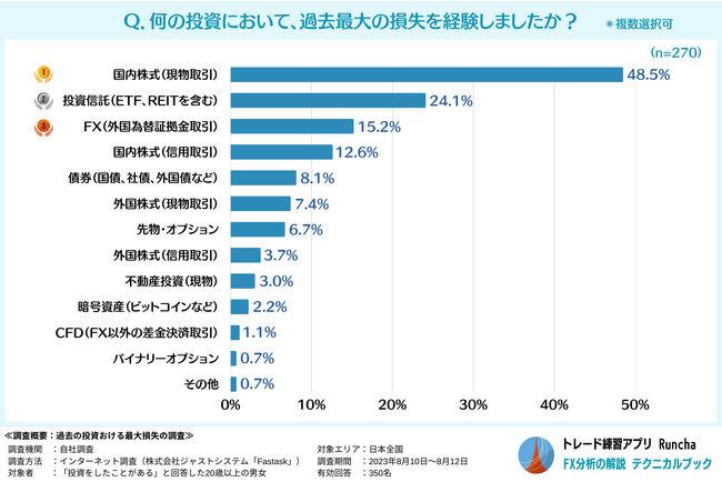 何の投資において過去最大の損失を経験したか質問したところ、最も多いのが「国内株式(現物取引)」の48.5%、続いて「投資信託(ETF、REITを含む)」の24.1%、「FX(外国為替証拠金取引)」の15.2%という結果でした。