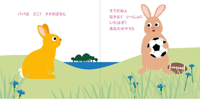 シンガーソングライターの依布サラサさんの翻訳による、パパを探す子うさぎの質問に答える大人うさぎのちょっと変わった返答は、くすっと笑える言葉にあふれています。