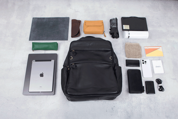 例)ノートPC(11〜17.3インチ) / タブレット / スマートフォン / 充電器・ケーブル類 / モバイルバッテリー / A4サイズの書類・ファイル / 手帳 / 筆記用具 / 財布 / 名刺入れ / 眼鏡