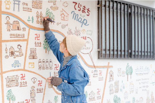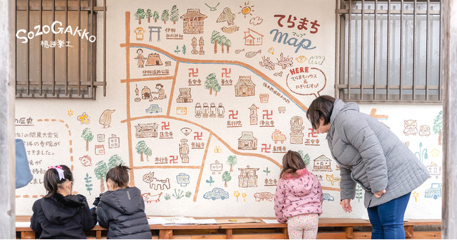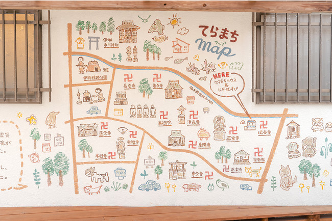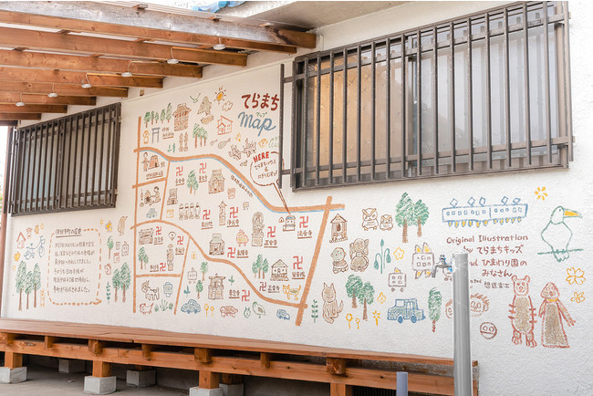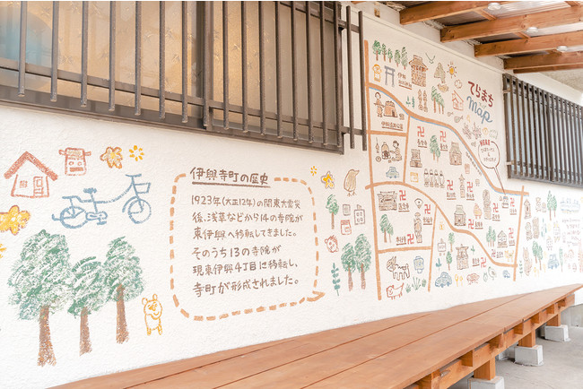 株式会社ニューモア(本社:東京都三鷹市 代表取締役:YORIKO)が企画運営する、障害を持つ人々の絵を商業デザインに展開する事業「想造楽工(そうぞうがっこう)」。親子のためのサードプレイス運営をする足立区の任意団体「コミュニティKoen」からの依頼により、足立区竹の塚「てらまちハウス」(コミュニティスペース・おにぎり屋)にて寺町エリアの壁面マップ制作を行いました。イラストレーションは地元の子どもたちと、社会福祉法人あだちの里「竹の塚ひまわり園」生活介護部門の皆さんとコラボレーション。描いていただいた絵を主役にデザインを制作いたしました。