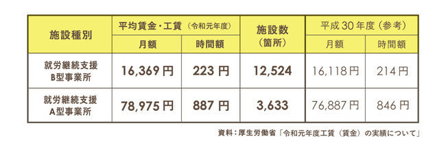 一般企業で勤めることが困難な障害のある方が所属する、就労継続支援事業所の利用者の月間平均賃金はA型で78,975円、B型で16,369円で(令和元年度)となっており、障害のある方の所得の低さが課題のひとつとして挙げられます。