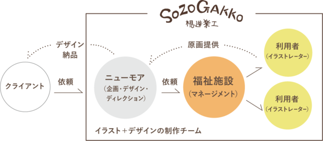 福祉作業施設に通う障害を持つ方をイラストレーターとして迎え、慈善事業ではなく「ビジネス」としてデザイン事業を展開しています。