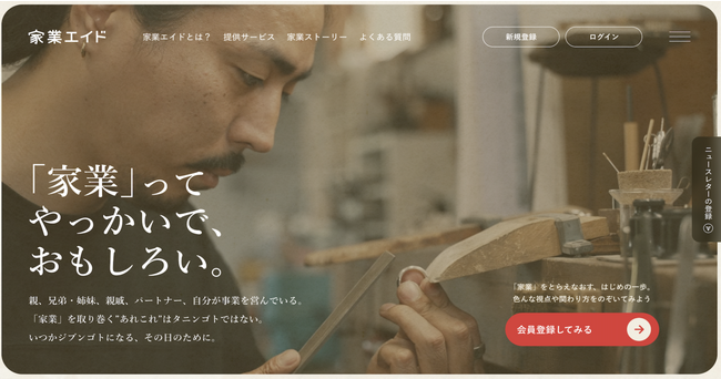 日本全国47都道府県から約10,000人の家業に関わる人たちがあつまる相互扶助プラットフォーム「家業エイド」が、連続リリース第一弾として、新サービスサイトを公開。
