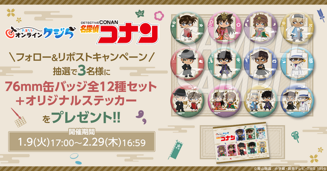 X(旧Twitter)オンラインクジらと名探偵コナンゼミ公式アカウントをフォロー&対象の投稿をリポストすると、抽選で3名様に「D賞76mm缶バッジ全12種+オリジナルステッカー」が当たるキャンペーンも開催中。