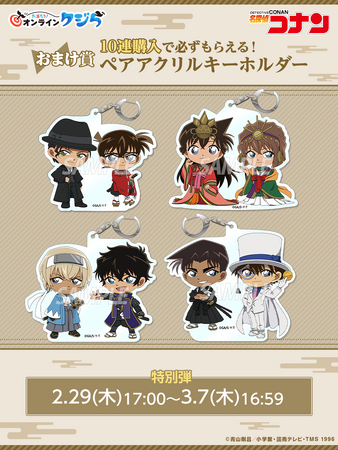 2024年2月29日(木)17:00~2024年3月7日(木)16:59まで特別延長販売期間中、【10連セット】購入で「ペアアクリルキーホルダー」コナン&赤井ペア、蘭&灰原ペア、安室&松田ペア、平次&キッドペアの中からランダムで1個プレゼント!