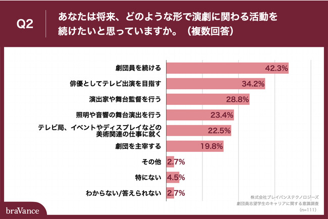 「Q2.あなたは将来、どのような形で演劇に関わる活動を続けたいと思っていますか。(複数回答)」(n=111)と質問したところ、「劇団員を続ける」が42.3%、「俳優としてテレビ出演を目指す」が34.2%、「演出家や舞台監督を行う」が28.8%という回答となりました。