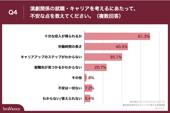 「Q4.演劇関係の就職・キャリアを考えるにあたって、不安な点を教えてください。(複数回答)」(n=111)と質問したところ、「十分な収入が得られるか」が61.3%、「労働時間の長さ」が40.5%、「キャリアアップのステップがわからない」が35.1%という回答となりました。