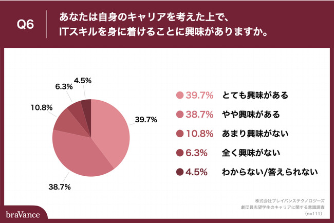 「Q6.あなたは自身のキャリアを考えた上で、ITスキルを身に着けることに興味がありますか。」(n=111)と質問したところ、「とても興味がある」が39.7%、「やや興味がある」が38.7%という回答となりました。
