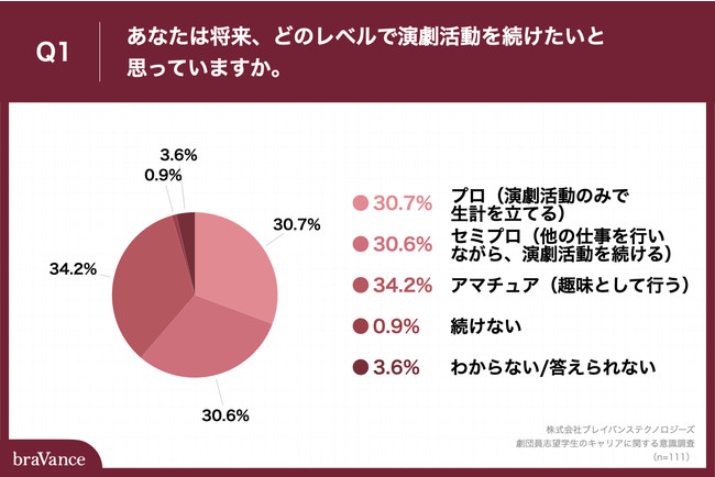 社会インフラであるネットワークシステムの企画・設計・構築・運用・監視を行う、株式会社ブレイバンステクノロジーズ(本社:東京都中央区、代表取締役社長:山田和則、https://www.bravance.co.jp/)は、社会人となり働きながらも演劇活動を続けたいと考えている学生111名を対象に、劇団員志望学生のキャリアに関する意識調査を行いましたので、お知らせいたします。