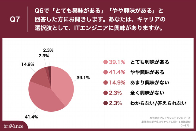 Q6で「とても興味がある」「やや興味がある」と回答した方に、「Q7.あなたは、キャリアの選択肢として、ITエンジニアに興味がありますか。」(n=87)と質問したところ、「とても興味がある」が39.1%、「やや興味がある」が41.4%という回答となりました。