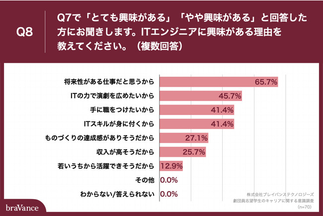 ITエンジニアに興味を感じる理由、約7割が「将来性があるから」、約5割が「ITの力で演劇を広めたいから」と回答