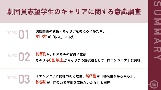 【劇団員志望学生、キャリアに関する不安は?】61.3%が演劇のキャリアを目指す上で「収入面」を不安視 キャリアの選択肢として、約8割が「ITスキル習得」に興味