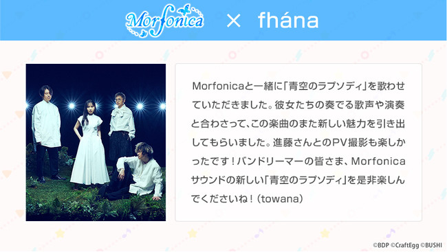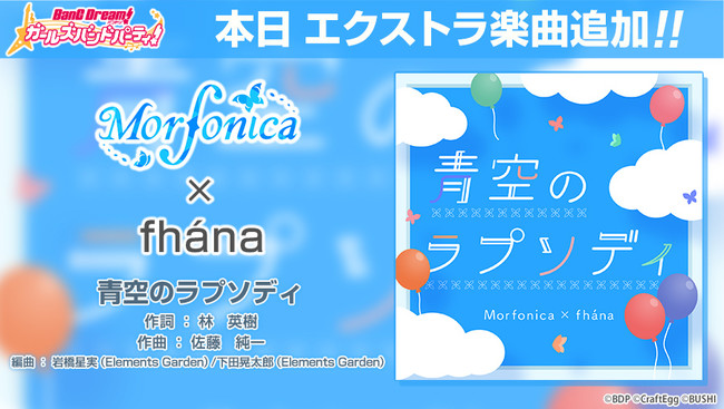 株式会社Craft Egg(本社:東京都渋谷区 代表取締役:森川 修一、以下、Craft Egg)と、株式会社ブシロード(本社:東京都中野区 代表取締役社長:橋本 義賢、以下、ブシロード)の共同制作によるスマホゲーム「バンドリ! ガールズバンドパーティ!」(以下、ガルパ)は、2022年4月28日(木)より、エクストラ楽曲第5弾として、Morfonica(Vo.倉田ましろ/CV.進藤あまね)とfhanaさんが歌うエクストラ楽曲『青空のラプソディ』をゲーム内に追加いたしました。