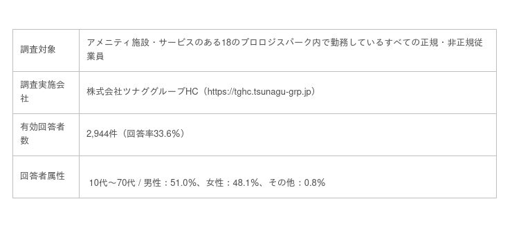 加えて、新型コロナウイルスのまん延状況を経て、衛生面の意識が高まっていることも確認できるなど、今後のプロロジスパークの就業環境の一層の改善に参考となる結果が得られました。