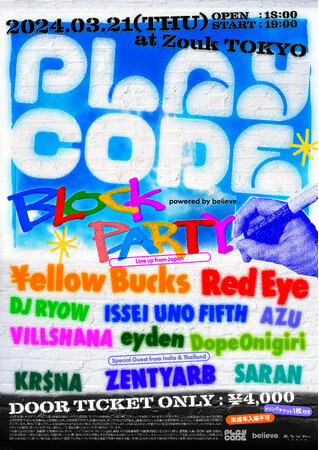 この「PLAYCODE」のローンチを記念し、豪華ヒップホップアーティスト達が登場する発足イベント 「PLAYCODE BLOCK PARTY powered by believe」 を2024年3月21日(木)、Zouk Tokyoにて開催します。