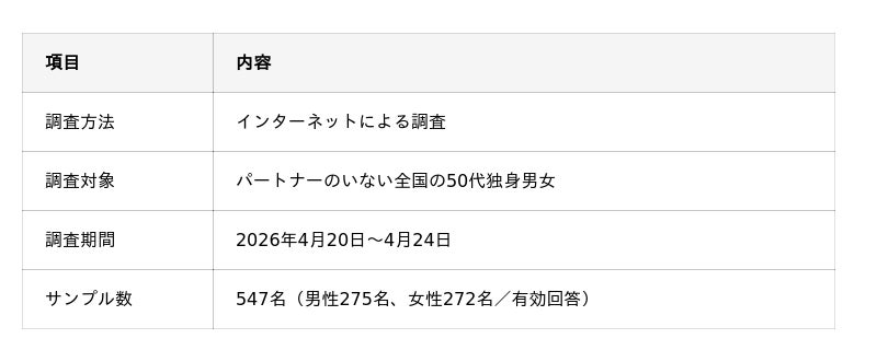 ここまで見てきたように、50代独身の男女は「どこで寂しさを感じるか」「どう行動しようとするか」といった点で、それぞれ少しずつ異なる傾向を持っています。共通する部分もあれば、異なる部分もある。ひとくくりの「50代独身像」ではなく、その内側にある男女それぞれの違いに目を向けたいデータです。