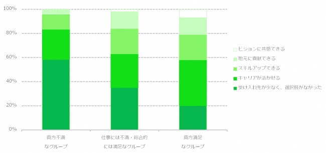 「仕事と生活の両方に満足なグループ」や「仕事には不満・総合的には満足なグループ」では、「キャリアが活かせる」「スキルアップできる」「地元に貢献できる」といったポジティブな理由を挙げる割合が高くなっています。