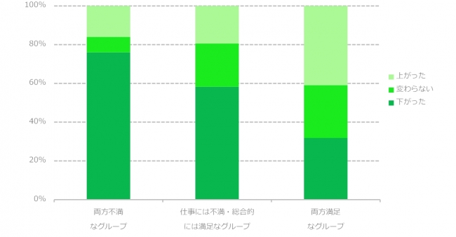 また、「仕事には不満・総合的には満足なグループ」については、“勤めていた会社に不満があったから”という回答が多く見られました。よりよい職場を求め、場所を変えて転職したものの、残念ながら、仕事への満足度を向上させることができなかったようです。