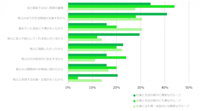 一方、「仕事と生活の両方に満足なグループ」は、“地元のほうが生活環境が充実するから”“地元に友人や協力してくれる知人がいるから”という回答が多い傾向にありました。人間関係を中心に、生活環境の充実が満足度の高さに影響しているようです。