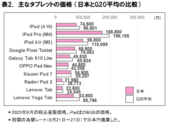 タブレット端末について見ると、iPadの日本での価格は74,800円(G20平均-13.8%)、iPad Proは168,800円(G20平均-14.0%)、iPad Airは98,800円(G20平均-15.3%)であり、G20平均と比べて15%前後安い。また、Google Pixel Tabletの日本での価格は68,800円(G20平均-7.1%)、Galaxy Tab S10 Liteは49,830円(G20平均-18.1%)となっている。