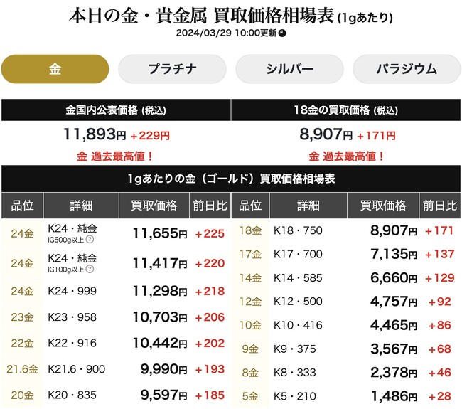 3/29(金) 金国内公表価格(税込) が11,893円 (前日比+229円)を記録し、2日連続で史上最高価格を更新しました。