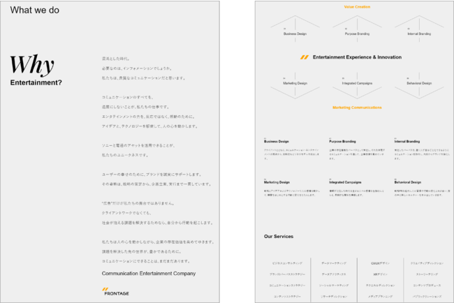 今回のリニューアルでは、フロンテッジが「コミュニケーション エンタテインメント カンパニー」として提供できることをわかりやすくお伝えするべく、デザイン・構成・コンテンツを全面的に見直し、リニューアルいたしました。