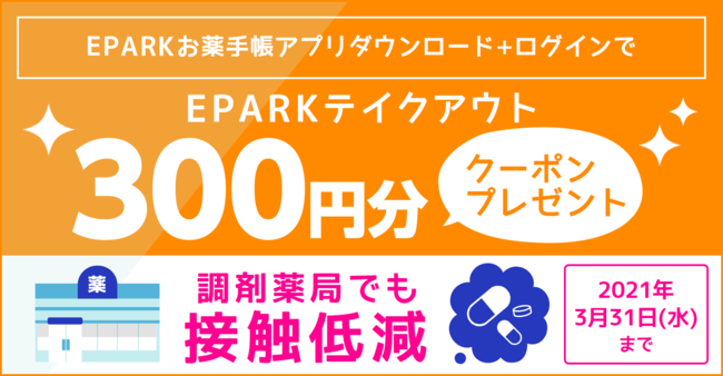 EPARKお薬手帳アプリのダウンロードとログインで、テイクアウトで使えるクーポンコードをプレゼント
