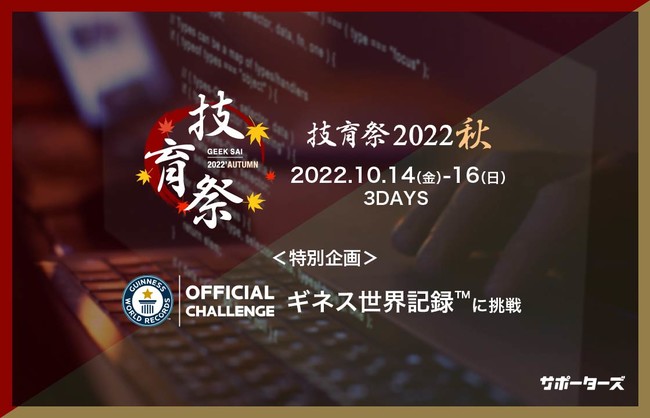 株式会社CARTA HOLDINGSのグループ会社で、キャリア支援事業を展開する株式会社サポーターズ(東京都渋谷区、代表取締役:楓 博光)は、エンジニア学生向けテックカンファレンス「技育祭2022【秋】」を、10月14日から3日間にわたって、オンラインにて開催いたします。今回が5回目の開催となり、エンジニア学生約3,000名が参加する見込みの国内最大級(サポーターズ調べ、2022年8月時点)のテックカンファレンスとなります。
