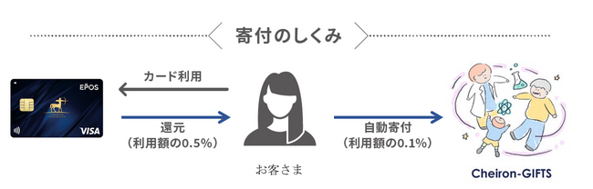 クレジットカードご利用額の0.1%分のポイントをお客さまからお預かりし、ケイロン・イニチアチブに毎月自動的に寄付いたします。また、カード新規入会1件につき1,000円が、エポスカードよりケイロン・イニチアチブに還元されます。寄付金は当面の間、当団体が行う助成金制度「Cheiron-GIFTS」(ケイロンギフツ)に活用します。