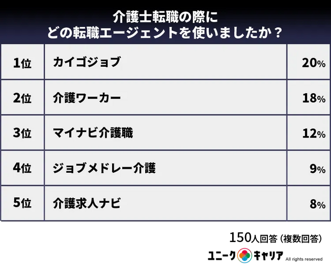 実際に転職エージェントを利用した経験のある150人に調査したところ、カイゴジョブが最も多く利用されていることが判明した。