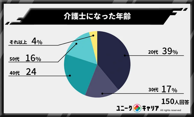 介護士として働き始めた年代は40代が24%。また、39%の人は20代から働いていることから、新卒で介護士になることが一般的でありつつ、いつからでも介護士デビューができることがわかる。