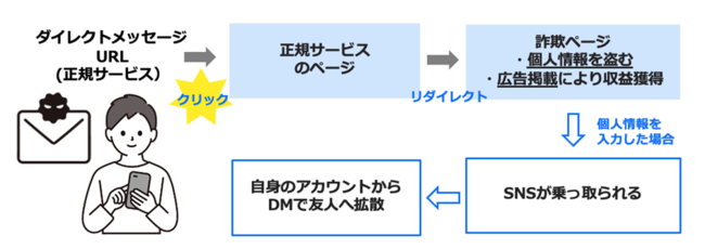 詐欺師は、簡単にブログ等を作成できるプラットフォームのサイトを悪用して「詐欺ではないサイト(正規サービスのサイト)」を作成し、そのリンクをDMに貼ります。DM上のリンクは正規サイトのもののため、SNS側に詐欺サイトとしてブロックされませんが、リンクをクリックすると正規サイトに飛んだ後に「詐欺サイト」にリダイレクトされます。詐欺サイトはFacebookをかたりログイン情報を求め、個人情報を盗もうとします。誤ってログイン情報を提供するとアカウントが乗っ取られ、自身のアカウントから友人へDMが送信されます。PIXM社の調査*2によると、2022年5月末時点で、関連の詐欺サイトに約1,675万件以上のアクセスがあったことが確認されています。(詐欺サイトには広告の掲載もあり、詐欺師はページの訪問者を増やすことで広告の収益も得ています。)