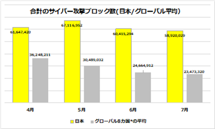 6-7月は日本だけではなく、グローバル全体でサイバー攻撃のブロック数が減少傾向にありました。下記の表は、日本のブロック数と主要8カ国*1 の平均値を並べたものです。グローバルの平均値は、4-5月は3,000万件以上でしたが、6月は約2,466万件、7月は約2,347万件と減少しました。