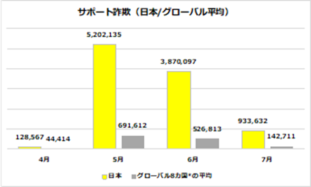 日本でブロックされたサポート詐欺の数は、 5月は非常に多かったもの、6月と7月は減少しました。5月は約520万件程でしたが、6月は約387万件、7月が約93 万件でした。グローバル全体でも、7月には減少が見られました。4月にも減少が見られたため一時的である可能性もありますが、日本がターゲットとなり、5月と6月に非常に多く検知されていたサポート詐欺が、7月には一度落ち着きました。