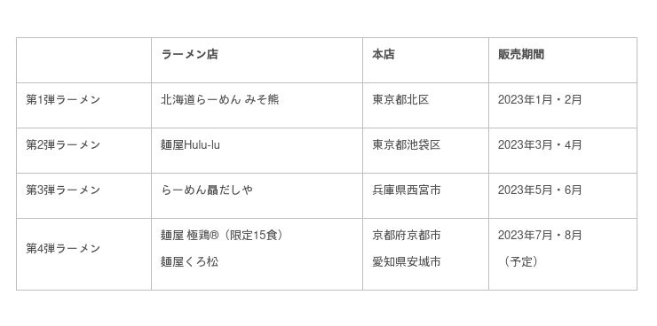 新大阪店・梅田店では、2ヵ月に1回ラーメンが入れ替わることを基本ルールとしており、オープンから現在まで新たな名店の味を販売提供しています。新大阪店では今回が第4弾ラーメンとして、京都からは極鶏(R)の「鶏だく(R)」・愛知からは麺屋くろ松の「焼きあご出汁の醤油らーめん」と2種類のラーメン店の味を楽しむことが可能です。どちらも本店1店舗でしか味わえない行列店の味を1カ所で楽しむことができます。