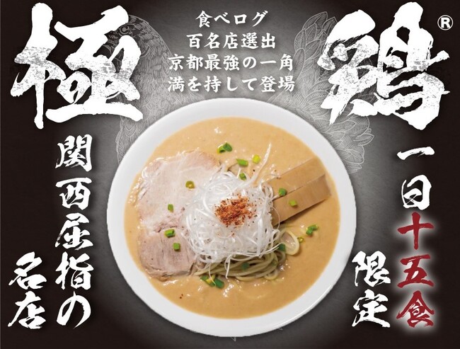 麺屋 極鶏(R)(以下、極鶏(R))は、京都府京都市にある関西でも屈指のラーメン激戦区「一乗寺」に本店を構え、ラーメン好きからの知名度が抜群に高い行列の絶えない名店と言われています。その実績は「食べログ ラーメン WEST 百名店 」に2017年から掲載されており、食べログのスコアも3.76(2023年6月23日 現在)と高い数値をキープしております。