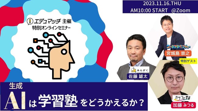 学習塾と教育サービスをつなぐ一括資料請求サイト「エデュマッチ」(共同代表:佐藤 雄太・田口 健吾)は、生徒の思考プロセス可視化ツール「NANDE」の日本e-Learning大賞「経済産業大臣賞」の受賞を記念し、11月16日(木)学習塾向けセミナー「AI×教育の未来・新時代の塾教育! 生成AIは学習塾をどう変えるか」を開催します。
