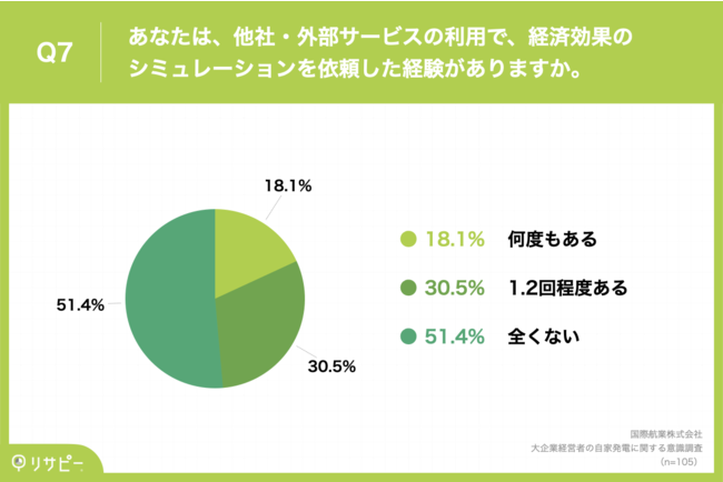 「Q7.あなたは、他社・外部サービスの利用で、経済効果のシミュレーションを依頼した経験がありますか。」(n=105)と質問したところ、「何度もある」が18.1%、「1.2回程度ある」が30.5%という回答となりました。
