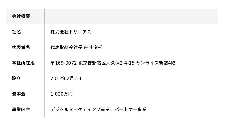 [画像7: https://prcdn.freetls.fastly.net/release_image/96030/20/96030-20-d0436db513bcf84ca8fda98653094153-713x180.png?width=536&quality=85%2C75&format=jpeg&auto=webp&fit=bounds&bg-color=fff ]株式会社トリニアストリニアスは、2012年2月に設立したデジタルマーケティング・コンサルティング会社です。