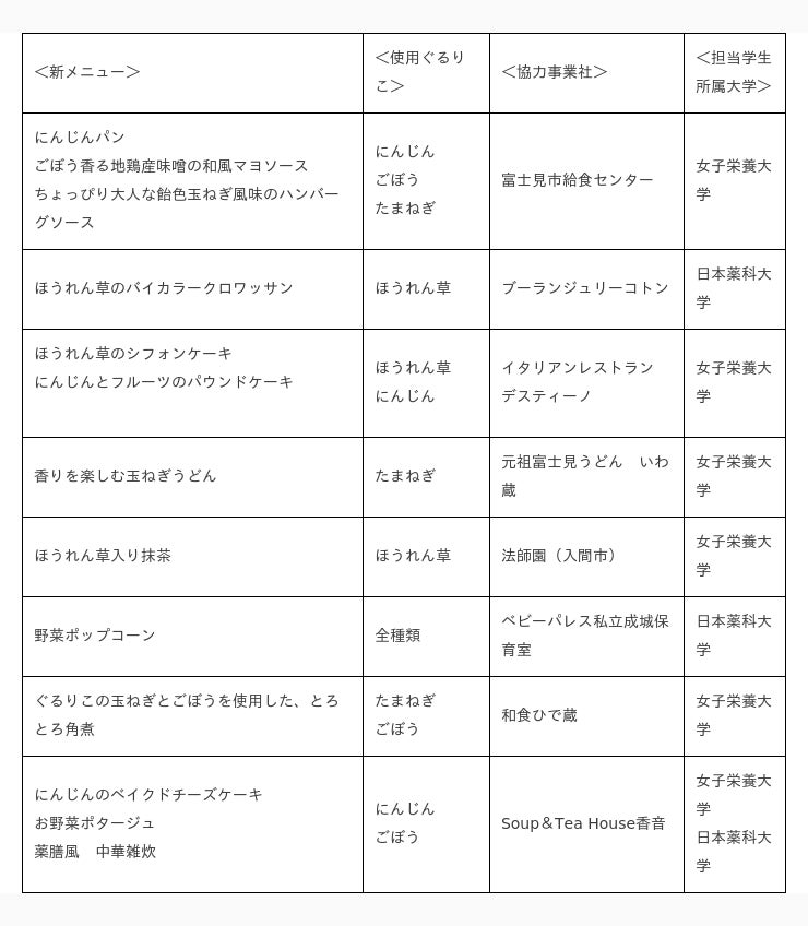 埼玉県の特産品を含む5品目(玉ねぎ、ごぼう、長ねぎ、ほうれん草、にんじん)の規格外農作物と県内の食品工場で発生する野菜の端材を粉末化した『ぐるりこ(C)』が、原料としてメニューや商品に使用されています。