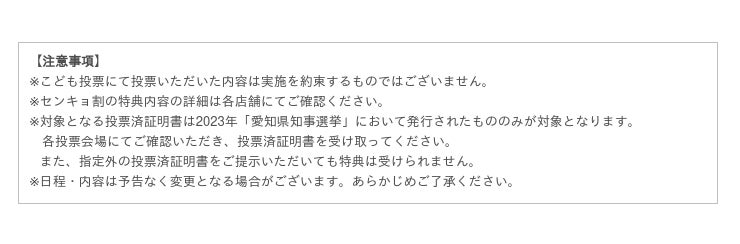 内 容 :「愛知県知事選挙」において発行された“投票済証明書”を、対象店舗にてご提示で