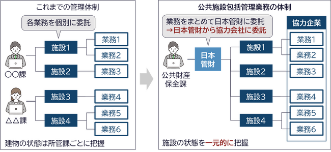 公共施設包括管理とは、地方公共団体が保有する公共施設の設備点検・修繕業務等を一括管理する管理方法です。施設の老朽化が課題となる中、建物や設備に関する保守点検や小修繕といった維持管理業務のマネジメント(契約、履行確認、支払い事務等)のほか、施設の巡回点検等を、施設管理の専門的知見を持つ民間事業者へ包括的に委託し、施設の安全性の向上や効率的な管理を目指すものです。民間の技術やノウハウを活用することで、管理品質の適正化、各業務における専門性の向上などが期待されています。