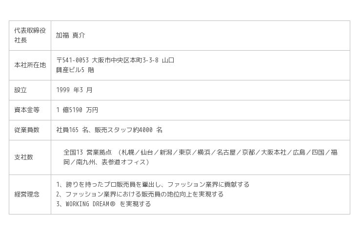 1999 年3 月に設立した、アパレル・ファッション・コスメ業界の販売職に特化したプロフェッショナルカンパニー。業界スペシャリティとして唯一47 都道府県を網羅し、キメ細やかなサービスを提供、独自の地位を築いてきました。ファッション・コスメ業界の数多くの著名ブランドの人材パートナーとして、 1500 社以上の取引先企業からの支持を得ており、人材紹介・人材派遣・教育・店舗運営・出店コンサルティング等を行っています。