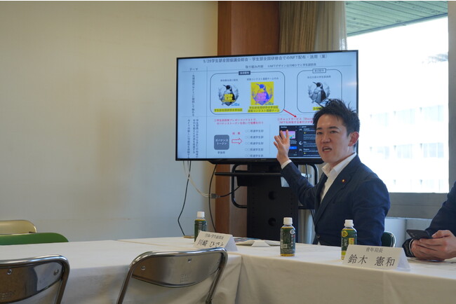 川崎 ひでと 青年局学生副部長は、ブロックチェーンの技術を活用したふるさと納税や、デジタル村民制度、ブロックチェーンとマイナンバーカードを用いたインターネット選挙の実証実験など、Web3.0を用いた取り組みが盛んになる中、自由民主党としても、こういった技術の活用を積極的に行なっていきたいという思いから、今回の取り組みに至った旨の説明と共に、昨年に引き続き本取り組みに協力している当社について紹介いただきました。