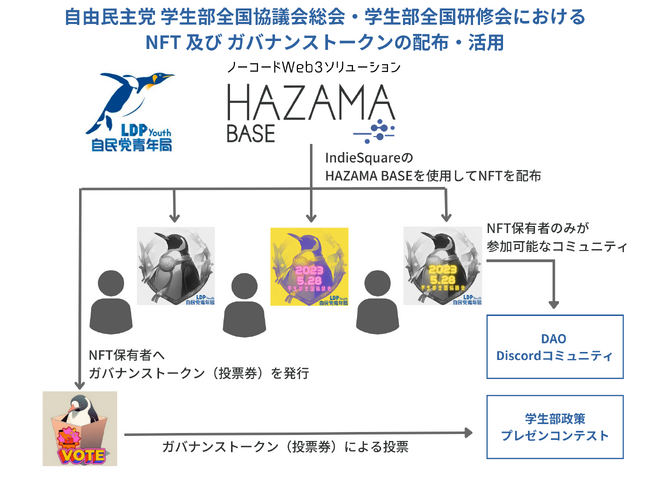 ブロックチェーン・スタートアップの株式会社IndieSquare(本社:東京都渋谷区、代表取締役社長:星野 裕太、以下「当社」)は、2023年5月27、28日に開催される自民党青年局会議・研修会で配布するNFTの発行及び当日の政策プレゼンコンテスト会場審査員投票の実施に、当社が開発するノーコードweb3プラットフォーム「HAZAMA BASE(ハザマ ベース)」が採用されたことを発表します。