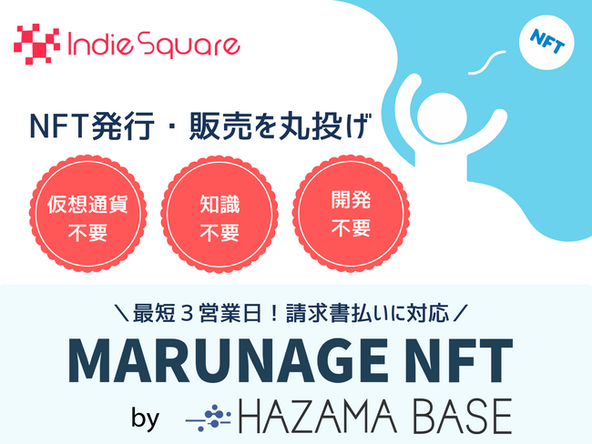 HAZAMA BASEで、当社のこれまでの経験を元にお客様のご要望に併せた最適なブロックチェーンの選定やNFT規格を提案します。すべて請求書払いで当社が代行することで、暗号資産やウォレットの管理、さらには法人や自治体様がweb3を始める上で大きく立ちはだかる期末会計等の会計・税務の問題を解決し、安全かつ迅速にweb3ビジネス展開をご支援するのが「MARUNAGE NFT」です。